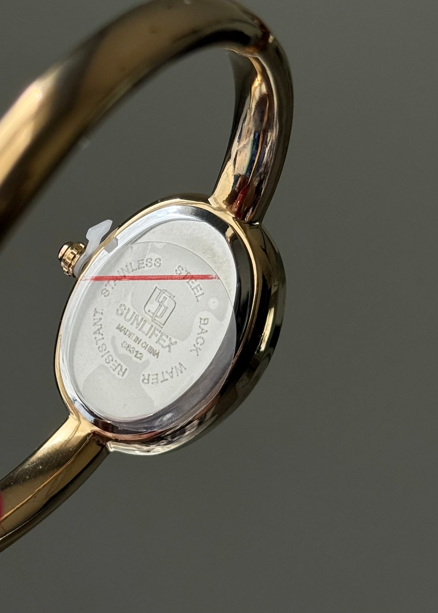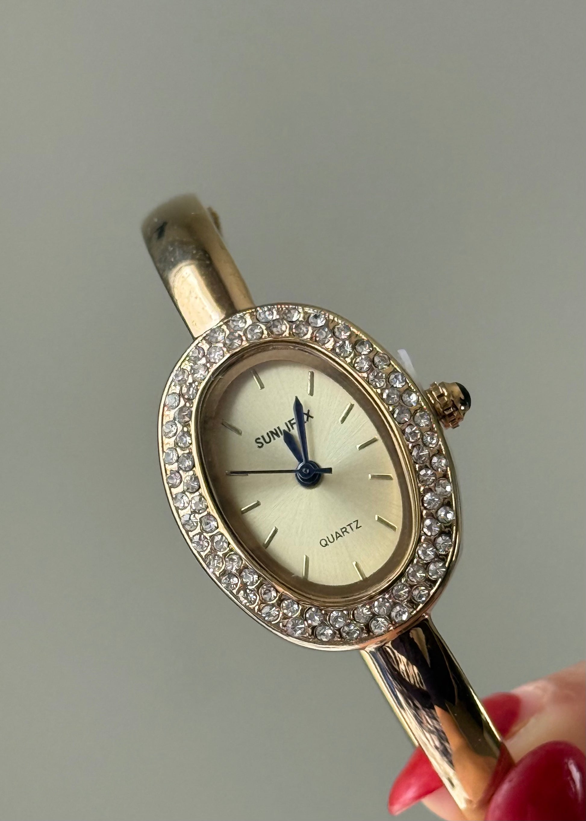 Diamora is a gold bangle bracelet watch with an elegant oval dial framed by diamonds, combining luxury and functionality in a timeless design.